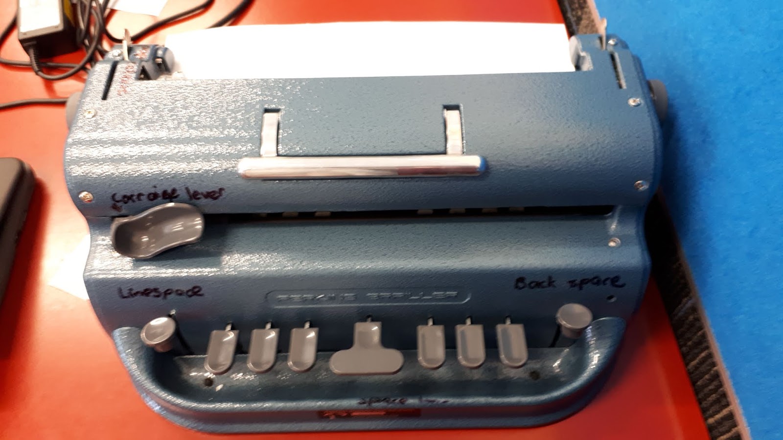 I do my writing in braille on a machine that looks a bit like an typewriter called a Perkins.